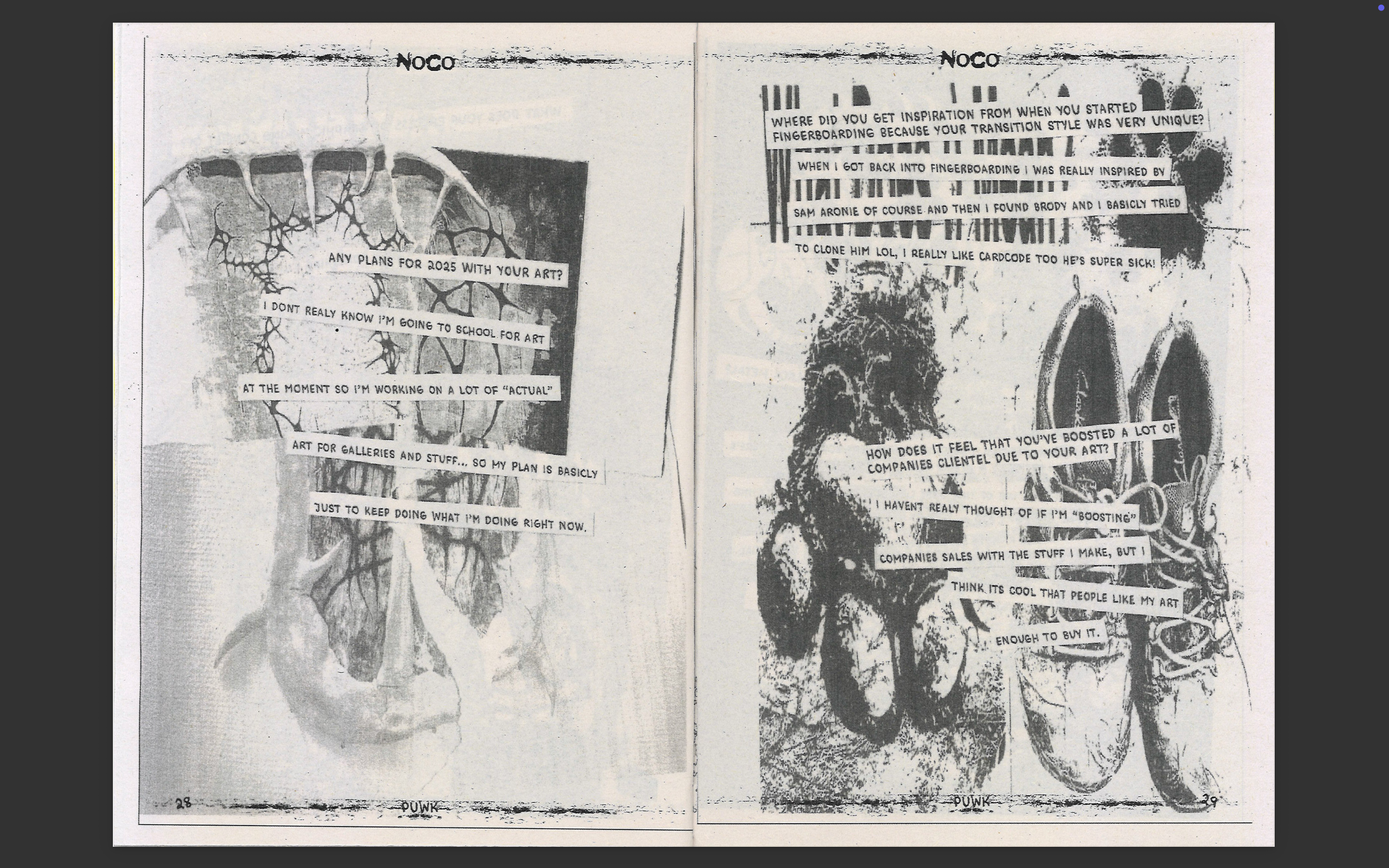 Hello!! This is the website for NoCo Magazine made by me (Noah Birtle/no.birt) featuring a lot of amazing people. The idea behind this magazine is to reignite the life of physical media within the fingerboard community as I believe a lot of the communities’ current history only resides within the infinite black hole of Instagram. I’ve been fingerboarding for the past 10 years but only discovered the online community in 2018. I’m so grateful to have connected with some of the most amazing people through this hobby and this magazine is my way of saying thank you to everyone out there.
